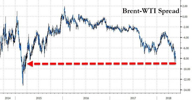 Есть и еще один крайне любопытный момент: разница в цене между североморской Brent и американской WTI. Она достигла $9, что является максимумом с марта 2015 г.