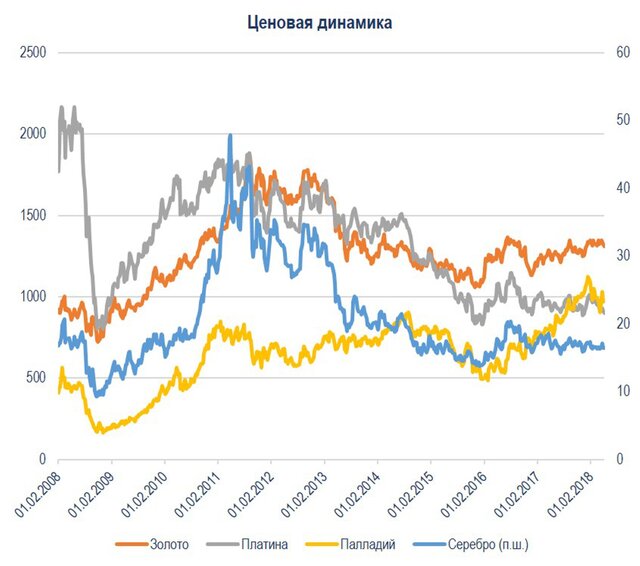 Действительно, со стороны ФРС пока сохраняются сигналы о сохранении нынешней монетарной политики и плановой траектории дальнейшего подъёма ставки. Это умеренно медвежьи сигналы для золота и серебра. Одновременно среди членов FOMC постепенно нарастает умеренно "голубиная" риторика, в том числе и со стороны Джеймса Булларда, что весьма необычно. Однако ожиданий дальнейшего восстановления американской экономики для подъёма цен на драгметаллы недостаточно, скорее, это могло бы влиять на палладий или платину как каталитические металлы и именно с этой стороной вопроса многие связывают прошлогоднее ралли палладия.