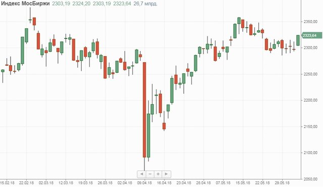 Отечественная валюта хотя и пытается реагировать на движение нефтяных котировок, но в целом продолжает оставаться под давлением покупок со стороны Минфина, которые продолжатся до 6 июня. Впрочем, если рублю и будет дана передышка с возможностью самому определяться, куда идти, то это ненадолго. Уже во вторник Минфин опубликует график покупок валюты в рамках бюджетного правила в июне. С учетом роста стоимости нефти, среднедневной объем операций по закупке валюты может оказаться на 2-2,5 млрд. рублей выше, чем в мае, а общий объем закупок дойти до 360-370 млрд. рублей. Сегодняшние торги отметились весьма существенной волатильностью внутри дня. Непосредственно с начала торгов рубль стал существенно подрастать и по отношению к доллару и по отношению к евро, растеряв, впрочем, добрую половину достижений уже к вечеру. По состоянию на 18:50 мск. за один доллар давали 62,02 рублей, а за евро - 72,50 рублей.