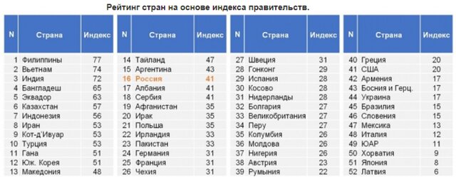 Только один из трех жителей планеты благоприятно оценивает деятельность правительства своей страны. Весьма значительны различия в этом вопросе как между глобальными регионами, так и внутри некоторых макрорегионов. Лидером рейтинга являются Филиппины, где индекс правительства оказался равен 77 п. п. Аутсайдерами же стали Латвия (6 п. п.) и Япония (8 п. п.). Россия набрала 41 п. п. и находится в этом списке на 16-м месте, опережая европейские страны и США.