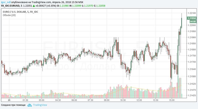 После этого рынок очень сильно ждал выступления Марио Драги. Оно началось в 15:30 по московскому времени. До этого реакция рынка была весьма сдержанной. Участники рынка начали продавать единую европейскую валюту. В паре с долларом она опустилась в моменте в район 1,2150, но затем практически вернулась к уровням, которые были до момента публикации итогов заседания.