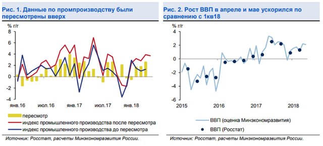 С учетом новых данных по промышленному производству оценка роста ВВП за апрель была пересмотрена до 2,2 % г/г. Основной вклад в ускорение экономического роста в апреле-мае внесли обрабатывающая промышленность, транспорт, оптовая и розничная торговля. Кроме того, в последние два месяца продолжилось восстановление строительного сектора (1,4 % г/г и 5,6 % г/г в апреле и мае соответственно) после слабых результатов I квартала 2018 г.