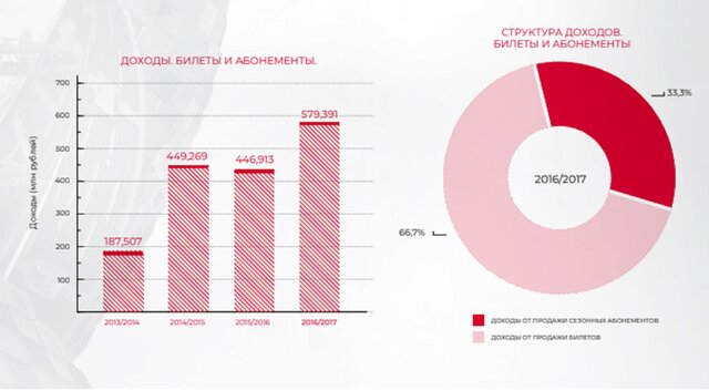 В чемпионском сезоне 2017/2018 "Спартак" заработал на продаже билетов и абонементов рекордную сумму – 579,4 млн руб. Еще 403,4 млн руб. принесла продажа vip-лож. В сезоне 2015/2017, когда "Спартак" с трудом занял лишь 5-е место в чемпионате, доходы по этим статьям были существенно меньше: от билетов и абонементов – 446,9 млн, от vip-лож – 302 млн.