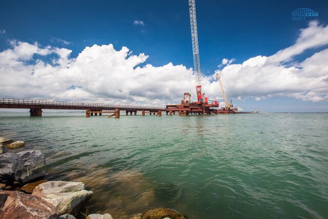 Строители моста в Крым из России через Керченский пролив приступили к возведению опор на морских участках. До этого возведение объекта велось на суше.