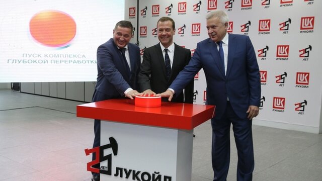 Церемония начала пуско-наладочных работ комплекса глубокой переработки вакуумного газойля. Премьер-министр Дмитрий Медведев с губернатором Волгоградской области Андреем Бочаровым и президентом ПАО "Лукойл" Вагитом Алекперовым.