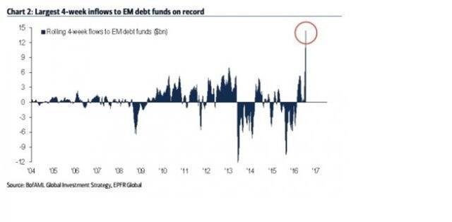 Очевидно, в поисках доходности инвесторы смещают интерес в сторону развивающихся рынков. Так, за минувшую неделю приток в фонды облигаций развивающихся рынков оказался рекордным.