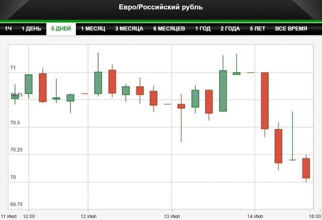 Курс евро опустился до отметки 70 руб. на торгах Московской биржи впервые с декабря 2015 г., свидетельствуют данные торгов. Курс доллара упал ниже 63 руб. впервые с 19 апреля 2016 г.