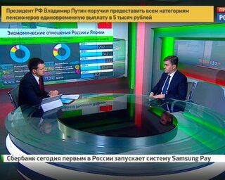 - Да, действительно, речь идет вот о чем. И с той и с другой стороны неоднократно звучали упреки, что потенциал наших экономических отношений не используется, не исчерпан. Как мне говорили японские коллеги, их уже стали раздражать эти фразы про потенциалы, пора эти слова переводить в дела. В этой связи было организовано несколько специальных форматов. Один из них это рабочие встречи между министрами экономик наших стран, между министром Алексеем Улюкаевым и министром экономики Хиросигэ Сэко, который одновременно является спец министром по России, с целью наметить несколько направлений сотрудничества, и по ним продемонстрировать конкретный результат.