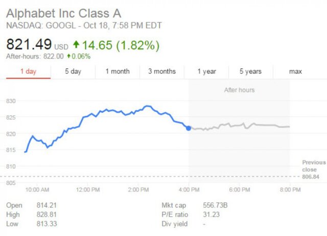 Стоимость акции Alphabet на Нью-Йоркской бирже в ходе торгов доходила до $828, что является наивысшим значением с августа 2004 года, когда Google только вышла на биржу. Чуть позднее цена немного корректировалась и составила $826,85 за акцию. Капитализация компании составляет $556,73 млрд.