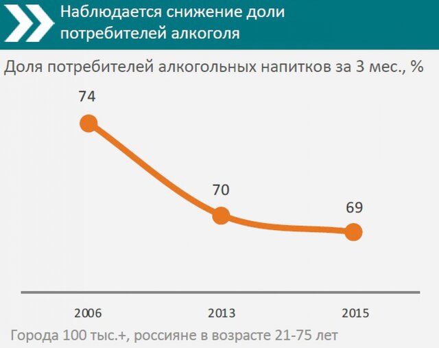 В 2006 г. доля тех, кто употребляет алкоголь хотя бы 1 раз в 3 месяца составляла 74%. В 2013 данный показатель снизился до 70%, в 2015 году – до 69%. По данным исследования, в последние годы в России также отмечается сокращение потребления алкоголя среди молодежи: по сравнению с 2013 г., число потребителей алкоголя в 2015 г. в возрасте 21–24 лет уменьшилось на 6%.