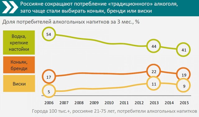 Тенденция по снижению потребления алкоголя отразилась не на всех категориях алкогольной продукции. В период 2006–2013 гг. доля потребителей коньяка и бренди увеличилась на 5%, виски – на 6% (в основном за счет возрастной группы 21–34 года), рома – на 2%. Однако из-за сравнительно высоких цен этих напитков в кризис доля их потребителей сократилась.