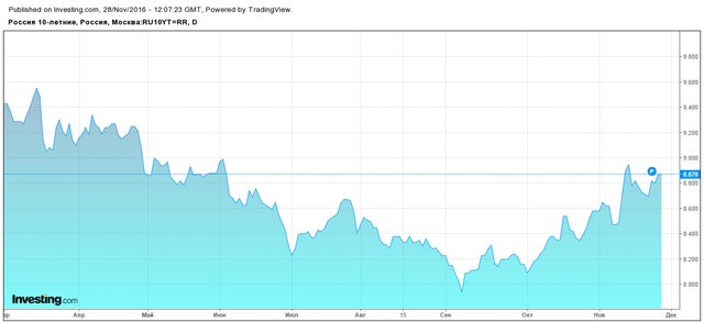 Поскольку глава Банка России Эльвира Набиуллина фактически обещала не менять ключевую ставку до конца года, то основным ориентиром для инвесторов становятся цены на нефть и курс рубля. В пятницу котировки "черного золота" рухнули сразу на 4%, вслед за ними упал и рубль, поэтому вряд ли кого-то удивляет тот факт, что доходность российских десятилетних бумаг снова приближается к отметке 8,9%.