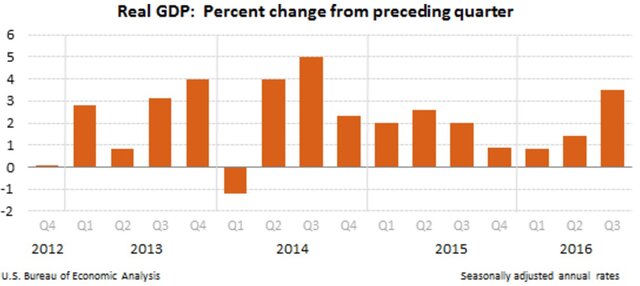 ВВП США в III квартале 2016 г. вырос на 3,5% в пересчете на годовые темпы, свидетельствуют окончательные данные министерства торговли страны.Ранее сообщалось о росте экономики США в прошедшем квартале на 3,2%. Опрошенные Bloomberg аналитики в среднем прогнозировали пересмотр темпов роста до 3,3%.