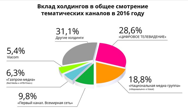 Социологи Института современных медиа проанализировали данные Mediascope по рынку тематического телевидения за 2016 год, рассматривая вклад холдингов телеканалов в общее смотрение тематического ТВ.