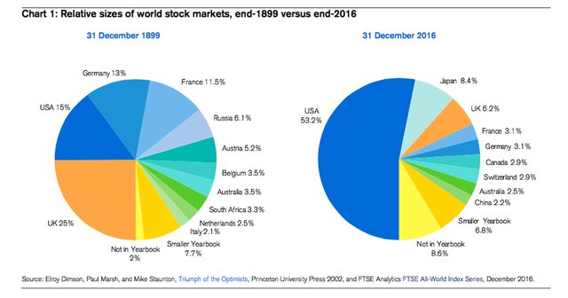 Аналитики также оценили долю российского фондового рынка в общемировой капитализации. Если на 31 декабря 1899 года она составляла 6,1%, то на 31 декабря 2016 года Россия не вошла в список стран, имеющих значительный объем национального фондового рынка.