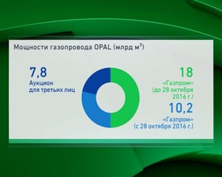 Как сообщали "Вести. Экономика", Еврокомиссия 28 октября 2016 г. разрешила "Газпрому" использовать до 90% мощности OPAL, тогда как ранее российская компания имела право на загрузку лишь 50%.