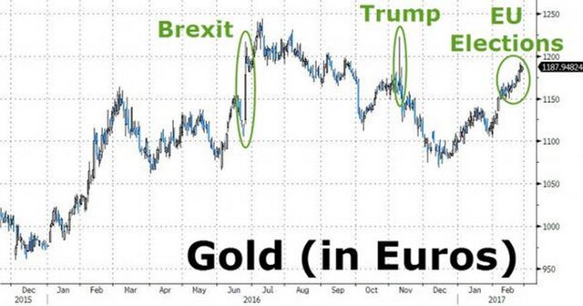 В то время как цены на золото в долларах повышаются, почти компенсировав потери после победы Дональда Трампа на выборах в США, стоимость драгоценного металла в евро взлетела на фоне неопределенности вокруг предстоящих выборов в Европе.Как сообщали