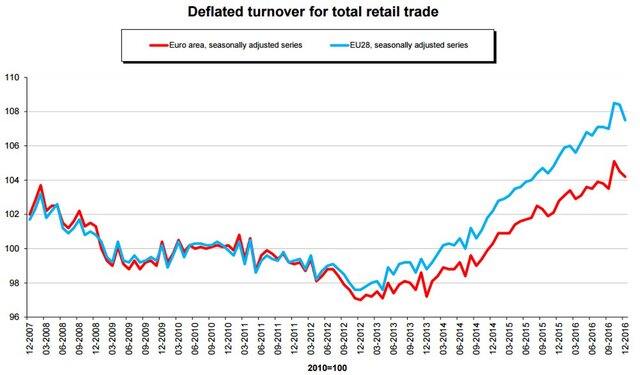 Максимальный месячный рост розничных продаж зафиксирован в Люксембурге (+1,9%), Бельгии (1,1%) и Франции (+0,8%). Максимальный спад наблюдался в Финляндии (-3,2%), Великобритании, не входящей в еврозону, но пока являющейся членом ЕС (-2,8%), а также в Ирландии и Швеции (-2,7% в обеих странах).
