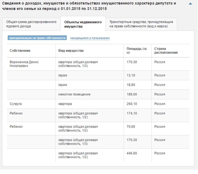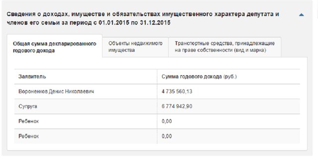 На сайте Государственной Думы приводятся сведения о доходах Вороненкова за 2015 год.