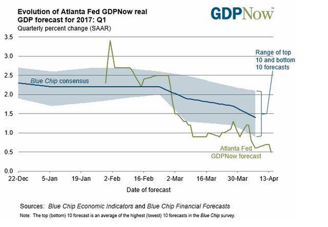 Сперва напомним, что еще пару месяцев назад модель прогнозирования ФРБ Атланты ожидала роста ВВП США в I квартале на уровне 3,4%, сейчас оценка рухнула до 0,5%. Если этот прогноз окажется верен, то темп прироста ВВП в I квартале 2017 г. окажется самым низким с начала 2014 г.