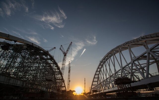 29 августа на мосту был завершен морской этап установки железнодорожной арки. Первым кораблем, прошедшим под аркой стал сухогруз "Святитель Алексей", следовавший из Азовского моря в Черное.