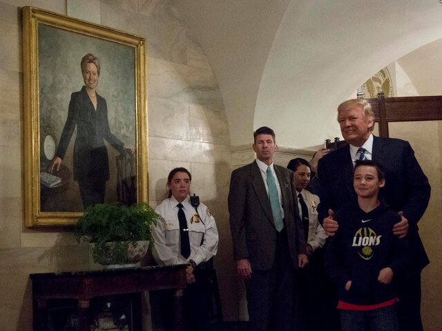 Трамп удивляет общественность, когда во время экскурсии по Белому дому позирует с юными посетителями на фоне портрета Хиллари Клинтон.