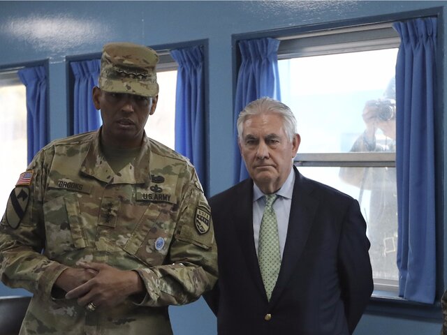 Госсекретарь Рекс Тиллерсон посетил границу Северной и Южной Кореи, заявив, что США могут нанести превентивный удар, если страна продолжит расширять свой ядерный потенциал. Кроме того, на этом фото северокорейский солдат фотографирует Тиллерсона со спины.