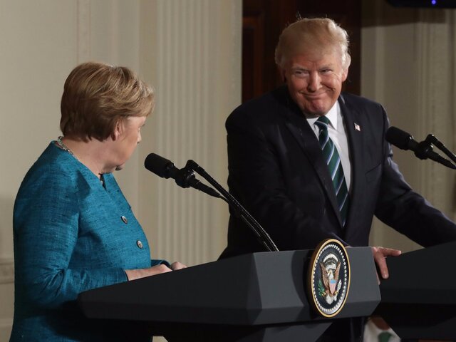 Трамп встретился с канцлером Германии Ангелой Меркель, с которой он обсудил вопросы, связанные с НАТО. Трамп вспоминает отчеты, согласно которым Меркель прослушивали в 2013 году, и шутит, что он и Меркель ∎имеют много общего".
