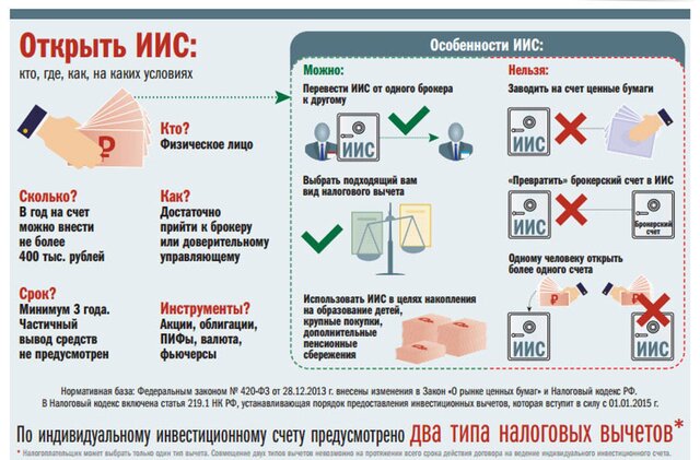 С 1 января 2015 г. физлица могут открывать ИИС у брокера (брокерский счет) или управляющей компании (счет доверительного управления). Помимо получаемого от инвестиций дохода, инвестор имеет право на один из двух видов инвестиционных вычетов по налогу на доходы физических лиц: вычет в размере 13% на сумму ежегодного взноса или освобождение от налогообложения всей суммы дохода, полученного на ИИС (при закрытии счета).