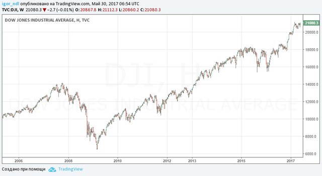 С момента кризиса 2008 г. индекс Dow Jones вырос на 230%, при этом стоимость акций по всем мультипликаторам уже давно выглядит чрезмерно завышенной.