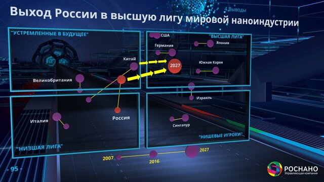 "Никогда государство, тупо действуя в этой сфере, а оно иначе и не умеет, не сформирует (такой заказ). Важно, что у нас по факту 22 миллиарда рублей в год – это построенные нами заводы платят науке ежегодно. Динамика этой цифры – 87 млрд рублей в год. Если я правильно помню, это больше, чем объем финансирования бюджетом Российской академии наук. Только там бюджет, а здесь настоящий заказчик. Это в некотором смысле, извиняюсь за пафос, перезапуск российской науки".Россия способна стать одним из глобальных технологических лидеров, считает Чубайс. В то же время наноиндустрия – очень хрупкая вещь. И в нашей стране есть силы, которые будут делать все, чтобы ее разрушить. О каких силах идет речь, лектор не уточнил и лишь специально поставил "знак вопроса" после утверждения о светлом нанобудущем России.
