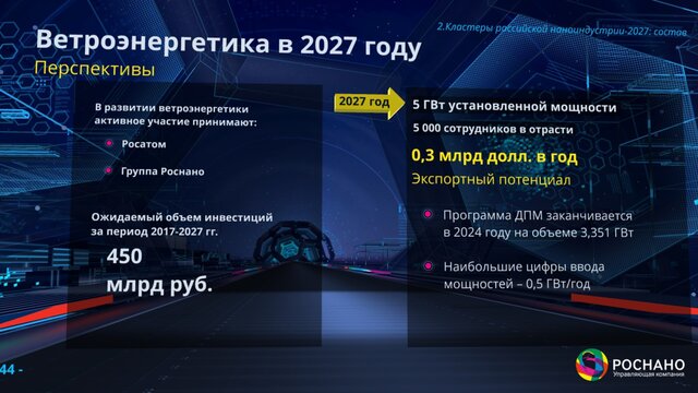 А вот энергия ветра – это пока "кластер-семя". Перспективы здесь серьезные – до 26% от всей выработки энергии в стране. Но на сегодняшний момент договоры об инвестициях только заключаются. УК "Роснано" обещает до конца этого года осуществить масштабный проект, который позволит говорить о существовании ветряной энергетики в стране. 450 миллиардов рублей – столько будет инвестировано в энергию ветра до 2027г. "Альтернативная энергетика станет уже не альтернативной, а основной", - утверждает Чубайс.