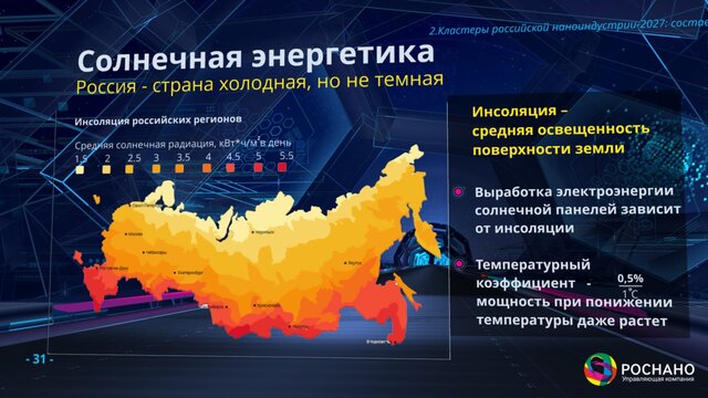 Последний из кластеров первой группы кластеров-саженцев – это солнечная энергетика. Лектор вспомнил, как ему приходилось спорить об альтернативной энергетике с Германом Грефом. Чубайс уверен, что солнечная энергия не просто может быть перспективным направлением развития российской энергетики, но уже ей стала.