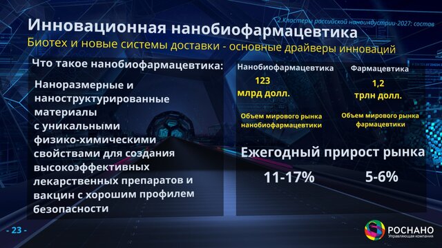 Переходя к фармацевтике, Чубайс отметил, что здесь хорошо сработала государственная программа по развитию отрасли до 2020г. И важно понимать, что речь идет не столько о восстановлении, сколько о создании производства с нуля, ведь и в советские времена фармацевтика была в Венгрии, Болгарии, а по факту в СССР ее не существовало, утверждает лектор. Фармацевтика растет на 10% в год, а вот нанобиофармацевтика – еще быстрее. Уже сегодня в России ее объем оценивается в 13 миллиардов рублей. При этом процесс внедрения технологий может занимать более 10 лет.