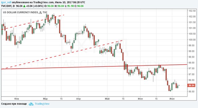 Индекс доллара к корзине шести основных валют еще с марта находится в нисходящем тренде.