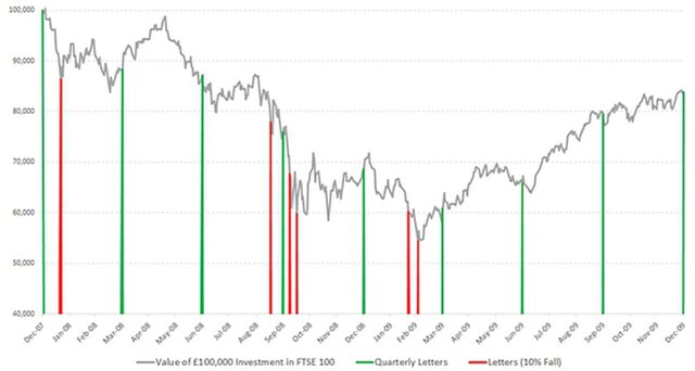 Чтобы проиллюстрировать, сколько таких уведомлений было бы отправлено в кризис, Killik & Co., лондонский менеджер по управлению капиталом, контролирующий активы на 5,5 млрд фунтов стерлингов ($7,25 млрд), наметил гипотетический портфель объемом 100 тыс. фунтов. Если бы эти средства были инвестированы в индекс FTSE 100 во время финансового кризиса, понадобилось бы отправить шесть предупреждений от начала спада до начала восстановления.