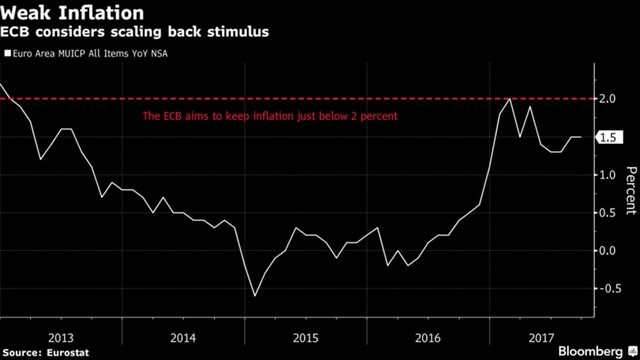 В минувшую пятницу агентство Bloomberg сообщало, что монетаристы якобы рассматривают возможность сокращения QE как минимум на половину - до 30 млрд евро в месяц начиная с января 2018 г. и до сентября следующего года, при условии, что срок может быть продлен, если потребуется.