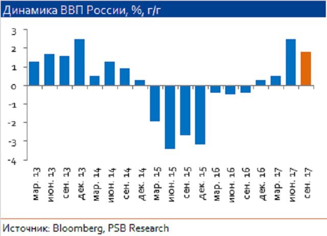 Теперь ситуация изменилась. Очевидно, что по итогам года промышленное производство покажет рост всего на 1,1-1,2% г/г. Тем не менее, темпы роста экономики в целом по году мы оцениваем в 1,7-1,8% г/г, что является достаточно хорошим результатом.