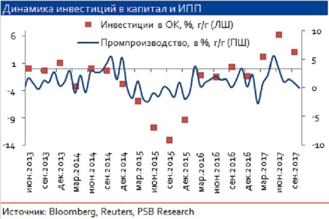 Промышленное производство в России в октябре 2017 года продемонстрировало нулевой прирост по сравнению с октябрем 2016 года. С одной стороны, этот результат объясняется высокой базой прошлого года – тогда промышленность выросла на 1,6% г/г. Тянут вниз промышленность добыча полезных ископаемых (-0,1% г/г) – нефти (-2,1% г/г) – на фоне соглашения ОПЕК+, что ожидаемо, так и производство и распределение э/э – снижение на 2,1% г/г.