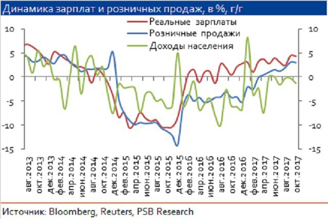 Блок макростатистики за октябрь вышел разнонаправленным: так, с одной стороны, реальные располагаемые денежные доходы населения усилили спад, показав снижение на 1,3% г/г, а реальные зарплаты напротив - выросли - на 4,3% г/г, опередив консенсус, предыдущее значение также было пересмотрено в лучшую сторону - с 2,6% - до 4,4% г/г.