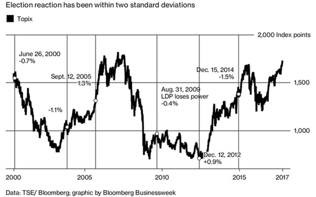 В шести случаях голосования с 2000 года индекс Topix не закрывался ростом или снижением более чем на 1,5% в первый день после выборов, даже когда Либерально-демократическая партия в 2009 году потерпела поражение и перешла в оппозицию.