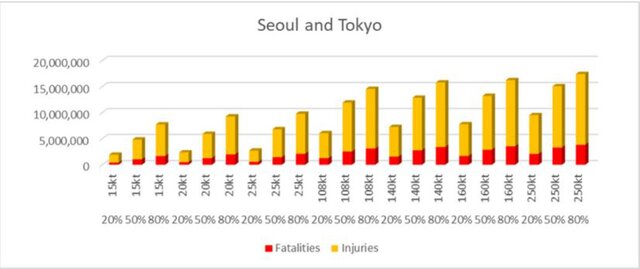 Согласно приведенным ниже расчетам, если бы произошло "немыслимое", ядерные взрывы в Сеуле и Токио с нынешними оцененными запасами ядерного потенциала в Северной Корее могли бы привести к 2,1 млн погибших и 7,7 млн раненых.