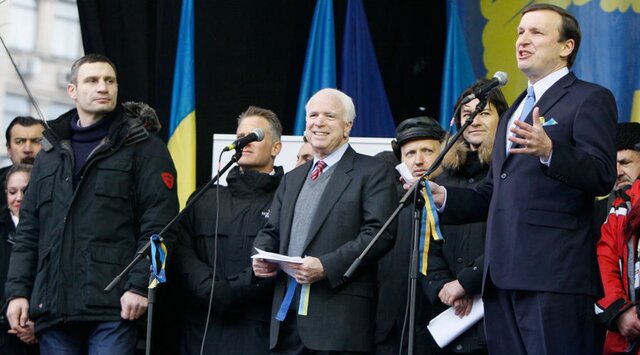 Сенаторы США Джон Маккейн и Крис Мерфи выступают в присутствии различных украинских деятелей на Майдане в Киеве, 15 декабря 2013 г. Фото: Глеб Гаранич / Reuters
