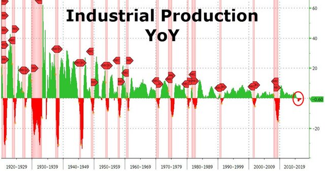 Ну и самое главное - промышленное производство. Показатель в годовом выражении падает уже 15 месяцев подряд - в истории США еще не было такого периода, чтобы спад в промышленности продолжался так долго без рецессии.