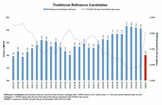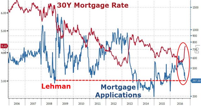Ну и еще один момент, который стоит отметить - рынок жилья. Тот стремительный рост доходностей трежерис, который мы наблюдаем с момента выборов, делает свое дело. Понятно, что рост доходностей по трежерис приводит и к росту доходностей по ипотечным облигациям. Так вот, за последние четыре недели мы видели буквально беспрерывное падение заявок на ипотеку - до минимума года. Последний раз столь сильное сокращение потенциальных заемщиков наблюдалось в период краха банка Lehman Brothers.