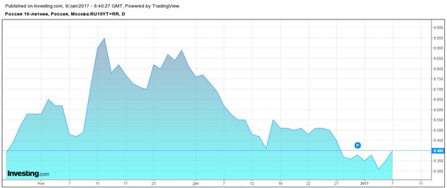 Сейчас доходности десятилетних ОФЗ находятся на уровне 8,4%, при этом максимум 2016 г. зафиксирован на уровне 10,91%. Минимум же отмечен в сентябре - чуть ниже 8%. Тогда инвесторы были уверены, что Банк России снизит ставку, однако Эльвира Набиуллина дала понять, что спешить не будет и в 2016 г. ключевая ставка больше не опустится.