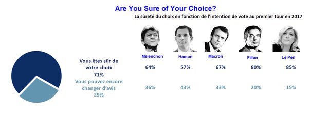 Ле Пен и Фийон пользуются относительно стабильной поддержкой избирателей. Чего не скажешь о Хамоне, Мелешоне и Макроне, у которых с поддержкой избирателей явные проблемы. Например, 33% избирателей от предполагаемой базы избирателей Макрона могут не проголосовать за него.