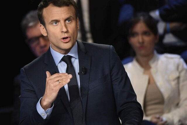 Согласно опросу Harris Interactive для France Televisions, Макрону отдали предпочтение 25% людей в первом туре голосования 23 апреля, в то время как ультраправый кандидат от партии "Национальный фронт" Марин Ле Пен получила 24%.