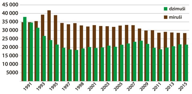В 2016 г. число умерших в Латвии на 7 тыс. превысило число новорожденных. При этом еще 10 тыс. латышей эмигрировали в страны дальнего зарубежья. При сохранении данной тенденции через 5–10 лет уровень рождаемости в Латвии сократится еще более заметно из-за дальнейшего снижения числа потенциальных родителей.