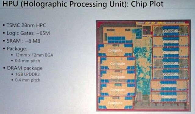 Основной интригой являлся чип, ответственный за всю "смешанную реальность". HPU или Holographic Proseccing Unit — фактически третий процессор в дополнение к графическому и центральному, которые играют вспомогательную роль и служат в основном для запуска и поддержки работы приложений.